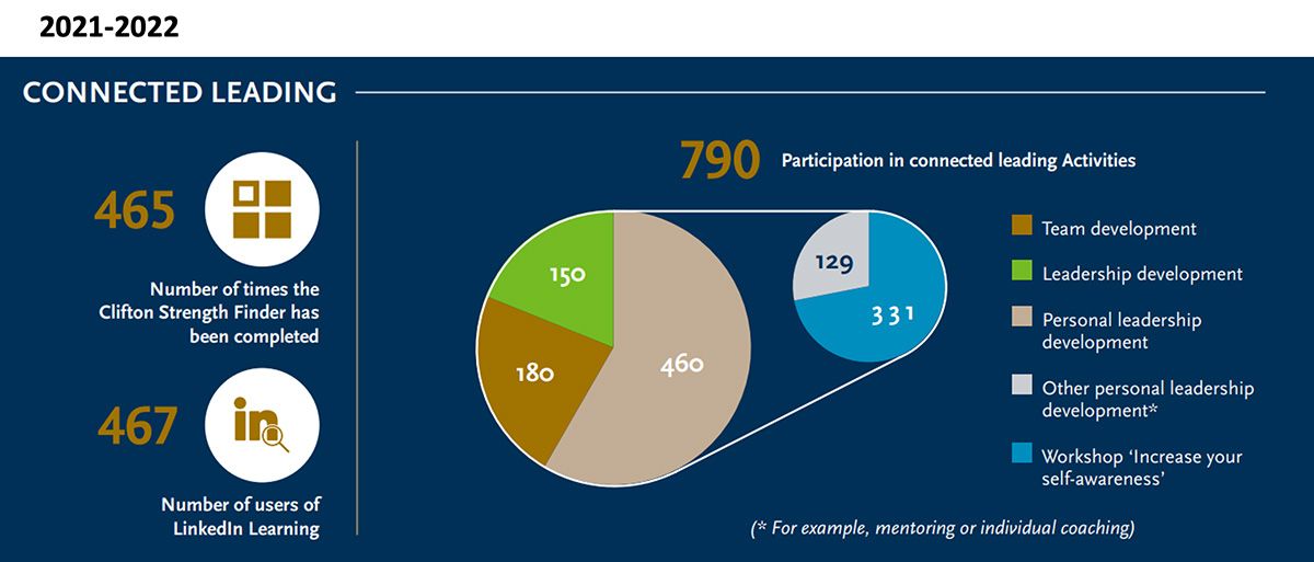 The evaluation of the Connected Leading programme in mid-2021 showed that for about two-thirds of the respondents, participation led to a change in behaviour (in line with the Connected Leading philosophy). Three-quarters or more (between 75%-88%) of respondents indicated that participation has led to a greater awareness of the importance of the individual Connected Leading behaviours. For 88% of respondents, participation in one or more Connected Leading activities has led to a better understanding of their own preferences and/or talents.